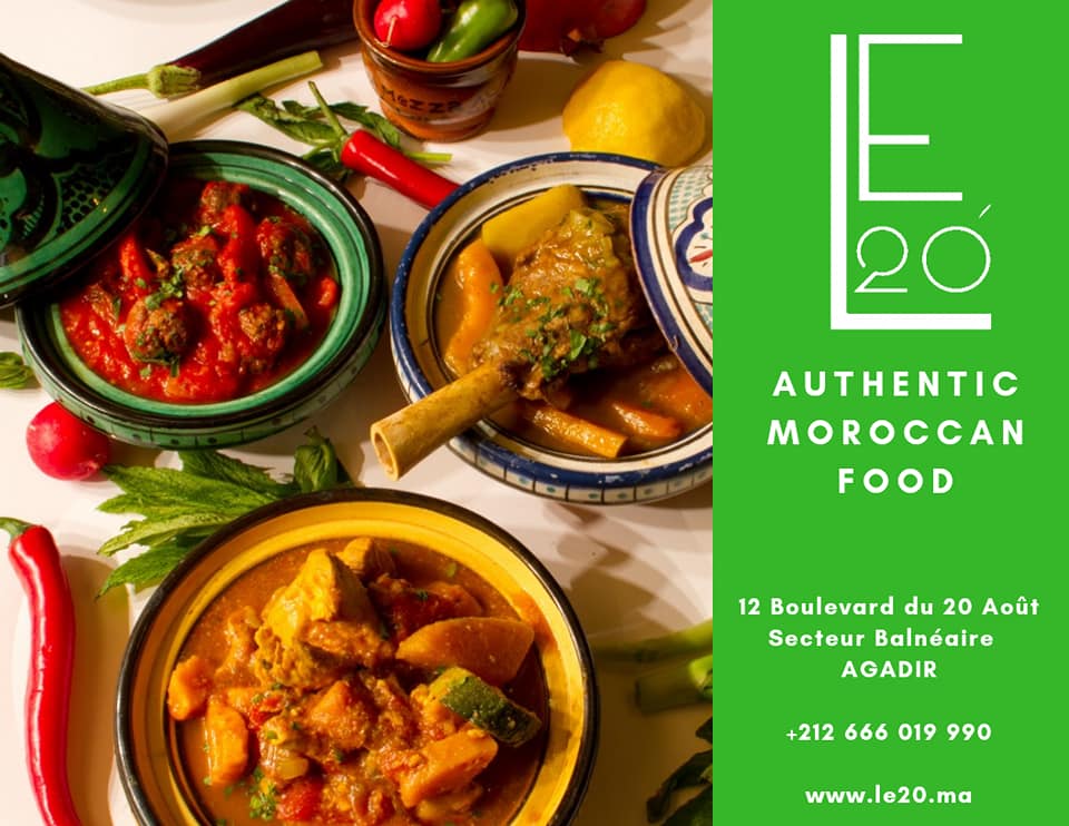 Le 20' Restaurant vous propose une carte variée avec toute la fraîcheur du Poisson et le meilleur de la Cuisine Marocaine. Sans oublier une grande variété de Vins à votre bonheur.